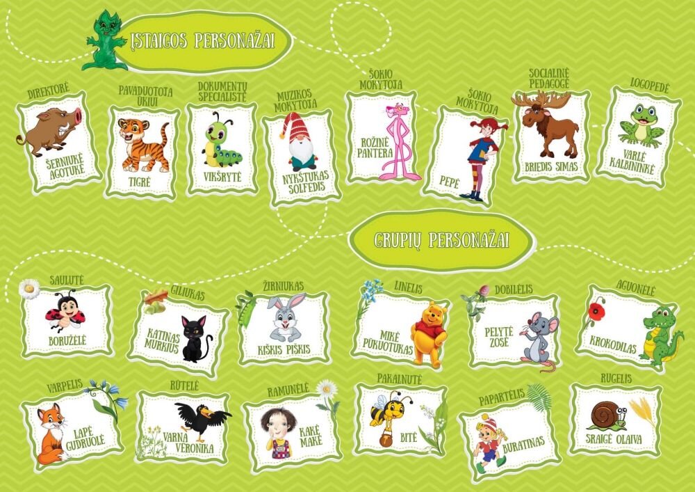 Ugdymo proceso metu sumoduliuoti personažai- didysis (kurį įkūnija auklėtoja arba švietimo pagalbos specialistas, esant poreikiui) ir mažasis ( kuriame įsikūnija pats vaikas). Kiekviena grupė turi galimybę pasirinkti, koks tai bus personažas. Faktinis vaikų siūlymas visad siejamas su einamosios media- edukacijos populistika ( žiūrimiausia animacija, populiarios akcijos ir tt.)